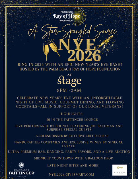 The Palm Beach Ray of Hope, in partnership with Michelin-rated Stage, presents the ultimate New Year’s Eve 2026 celebration. From 8 PM to 2 AM, indulge in a lavish Champagne lounge, raw bar, exquisite five-course dinner, and premium open bar. Dance the night away with live entertainment throughout the night , and toast to the new year with an epic balloon drop at midnight. The best party in Palm Beach County—all in support of our local veterans.